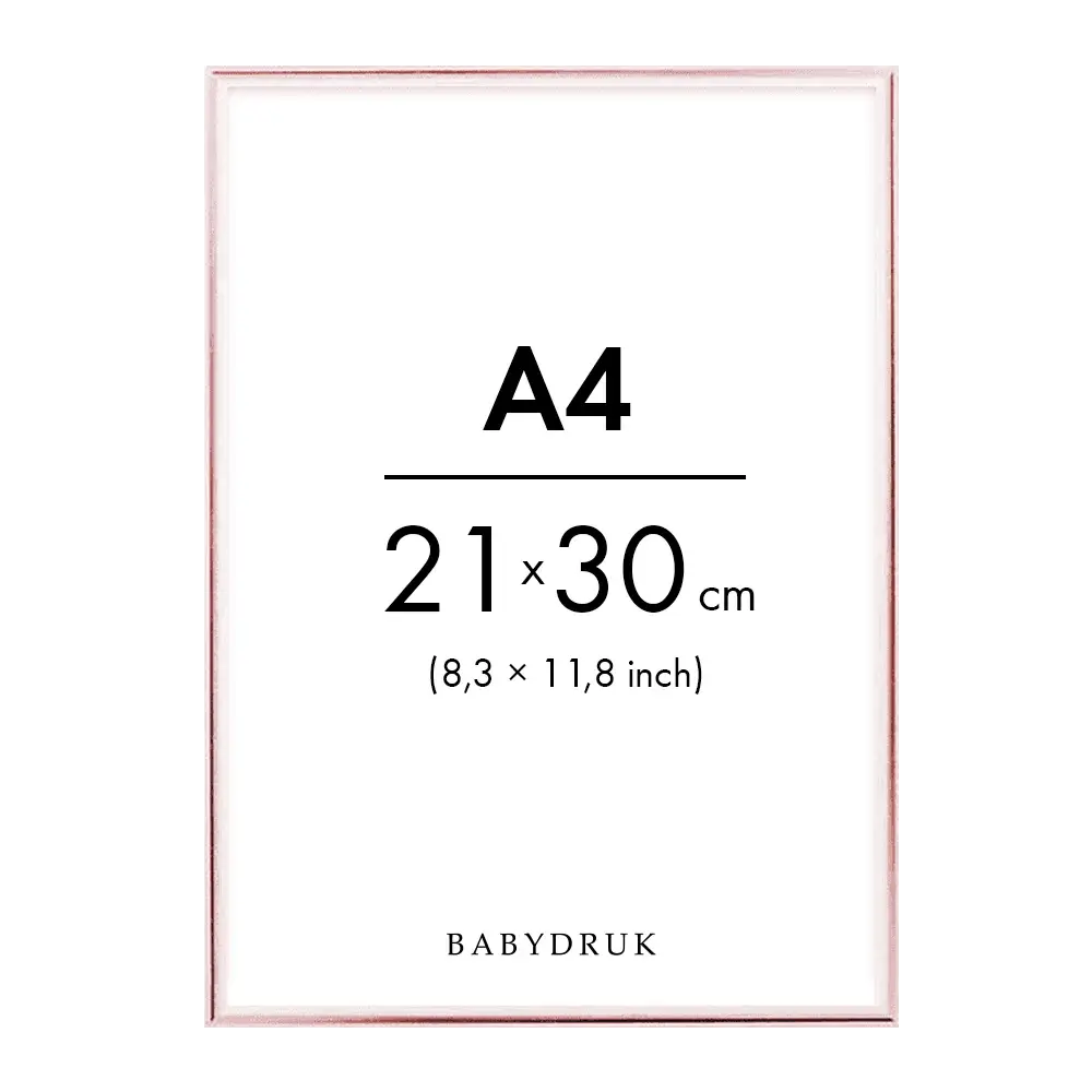 Stylish rose metallic frame that fit 21×30 cm posters. The metallic frame is equipped with crystal clear acrylic glass and is easy to open at the back using metal clips that turn sideways. The glass is protected on both sides with a protective film that is removed before use, to ensure a perfect experience. Our 21×30 cm rose metallic frames are equipped with two hangers of metal, making it easy to hang them both horizontally and vertically.
